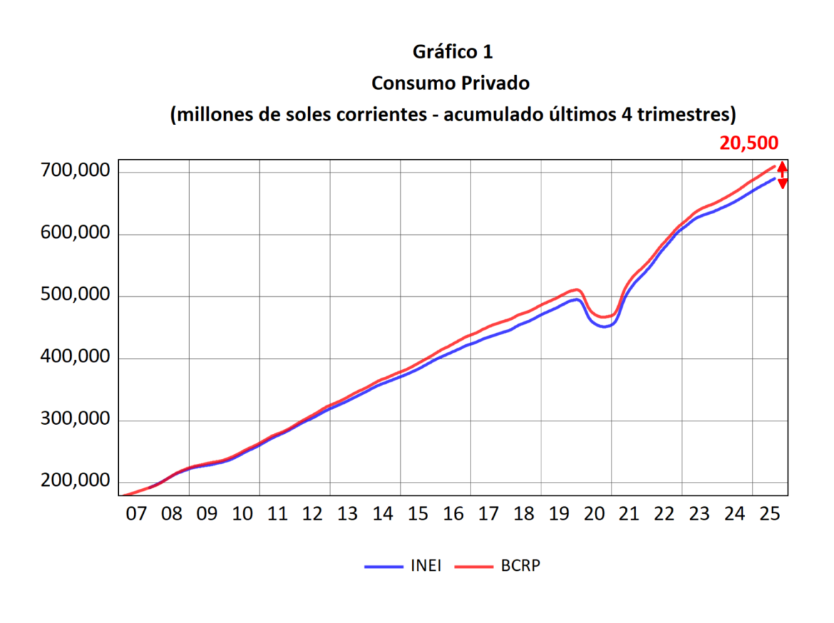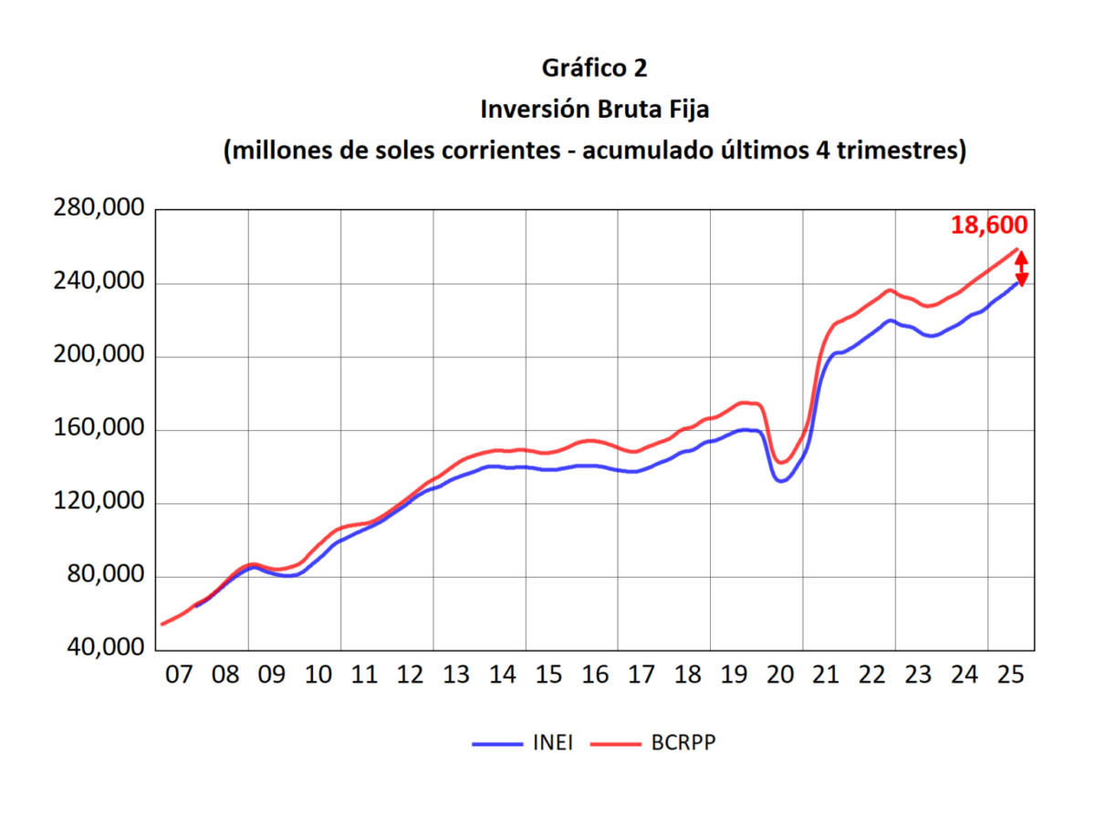 Un caso ilustrativo es la estimación de la Inversión Bruta Fija (ver Gráfico 2). Las diferencias alcanzan 18,600 millones de soles, equivalentes a 1.5% del PBI. Una brecha de esta magnitud modifica la evaluación sobre la dinámica de la inversión, las perspectivas de crecimiento y la generación de empleo, influyendo en la interpretación general del desempeño económico.