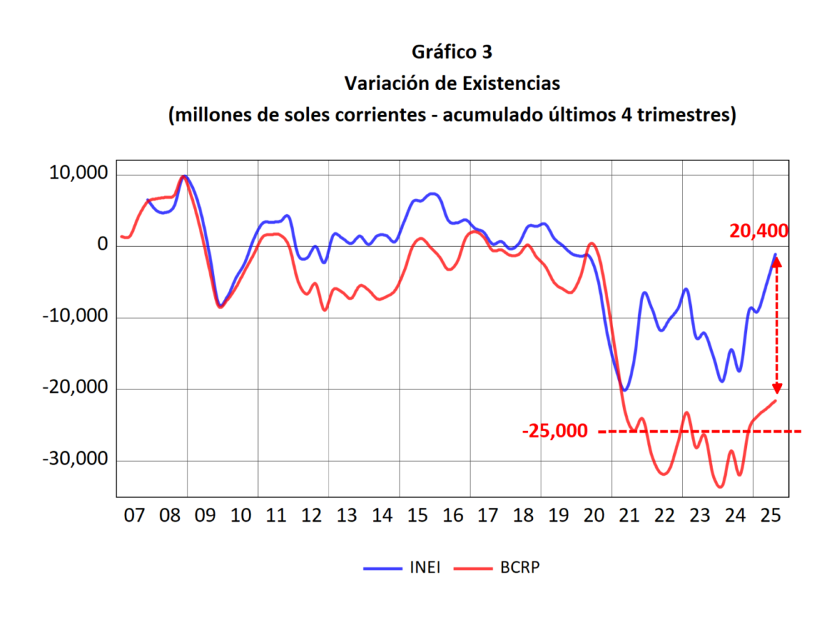 La brecha entre ambas mediciones se concentra con mayor intensidad en la variación de existencias —o inventarios—, componente del PBI por el lado del gasto que recoge la diferencia entre producción y ventas en un periodo determinado. En términos contables, este rubro funciona como un mecanismo de ajuste cuando las fuentes estadísticas no encajan plenamente entre sí.