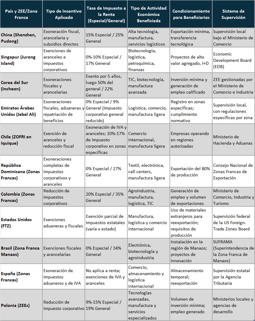 País y ZEE/Zona Franca Tipo de Incentivo Aplicado Tasa de Impuesto a la Renta (Especial/General) Tipo de Actividad Económica Beneficiada Condicionamiento para Beneficiarios Sistema de Supervisión