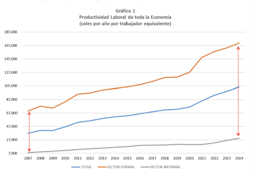Como podemos ver,  la productividad del segmento informal se ubica alrededor de S/ 27 mil por trabajador equivalente al año, frente a más de S/ 167 mil en el segmento formal. Aunque la productividad informal ha aumentado en términos nominales desde 2007, el avance real es limitado una vez descontada la inflación. La tendencia dominante es la ampliación de la brecha: el sector formal mejora su capacidad de generación de valor, mientras el informal permanece prácticamente estancado.