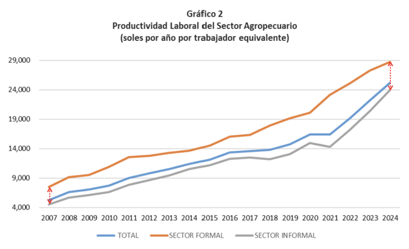 El sector agropecuario presenta los niveles más altos de informalidad del país: más del 95% de sus trabajadores opera fuera de la formalidad, en unidades productivas pequeñas, familiares y con escaso acceso a tecnología, financiamiento o mercados. Esta estructura limita la productividad por trabajador y reduce los ingresos a niveles de subsistencia. Como muestra el Gráfico 2, aunque la productividad del segmento informal ha crecido en la última década, sigue muy por debajo del promedio de la economía y del sector formal, lo que evidencia un rezago persistente.