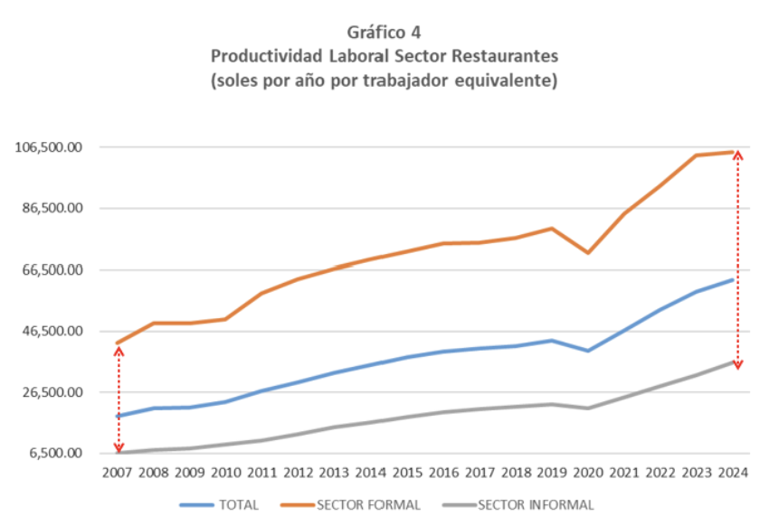 El sector de restaurantes y servicios de comida es uno de los segmentos de mayor dinamismo dentro de la economía peruana, pero presenta al mismo tiempo uno de los niveles más altos de informalidad. Más del 85% de sus trabajadores se encuentra fuera de la formalidad, principalmente en establecimientos pequeños y familiares que operan con baja capitalización y escasa capacidad de inversión. Esta estructura limita la incorporación de tecnología, restringe la productividad laboral y genera ingresos que no alcanzan para absorber los costos de un empleo formal. El Gráfico 4 muestra la evolución de la productividad del sector y evidencia que la brecha entre el segmento formal e informal se ha ampliado de manera constante en los últimos años.