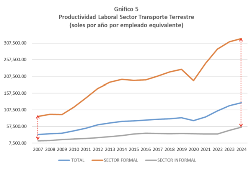 El sector transporte registra una de las tasas más altas de informalidad del país: más del 80% de los conductores opera sin contratos, sin beneficios y en unidades económicas de baja escala. Esta estructura limita la inversión en mantenimiento, seguridad y estandarización del servicio, y genera efectos directos sobre la movilidad urbana y la calidad del transporte público. El Gráfico 5 muestra que la brecha de productividad entre el segmento formal e informal se ha ampliado de manera sostenida, superando incluso a la observada en otros sectores intensivos en mano de obra.