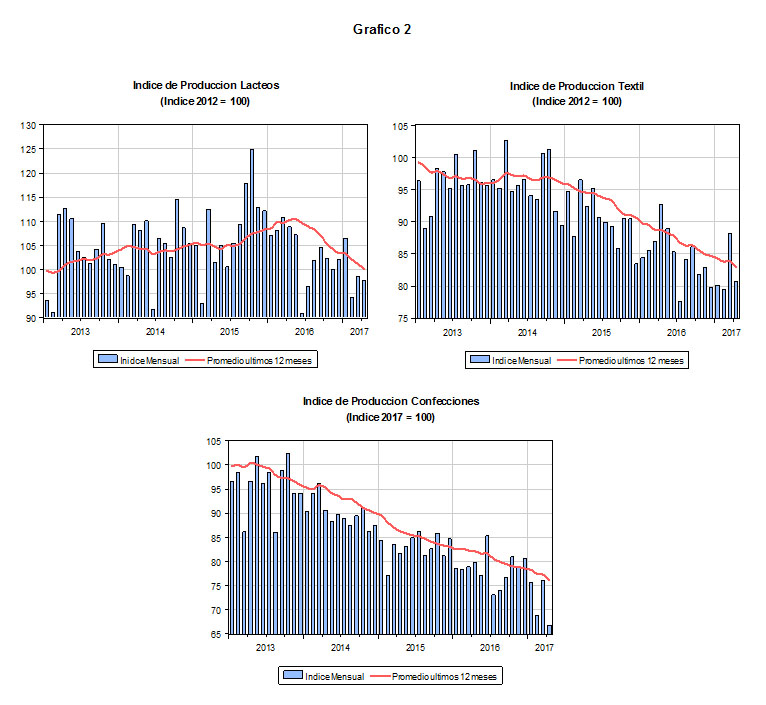 La situación es más grave aun cuando se analizan los subsectores de la actividad no primaria. Por razones de espacio no hemos graficado todos los subsectores de la actividad no primaria. En el Gráfico 2 se presentan las evoluciones de los índices de producción de los subsectores lácteos, textil y confecciones. En el caso de los subsectores textil y confecciones (y se aplica al subsector calzado también) la caída de la producción viene desde antes del 2012. Las caídas en estos sectores exceden el 20 % en relación con el 2012. En el caso de los lácteos es sorprendente ya que este sector venía creciendo hasta mediados del año pasado. La crisis que estamos viviendo con el caso de la leche Gloria es un reflejo de esta realidad.