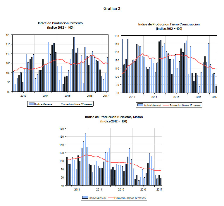Sin embargo el deterioro del subsector manufactura no primaria no solo se limita a los sectores textil y calzado, sino que se ha extendido a otros sectores también. En el Gráfico 3, se presentan las evoluciones de la producción de los subsectores cemento, fierro y estructuras para construcción y producción de bicicletas, motos y otros vehículos. Estas actividades están relacionadas con la inversión.